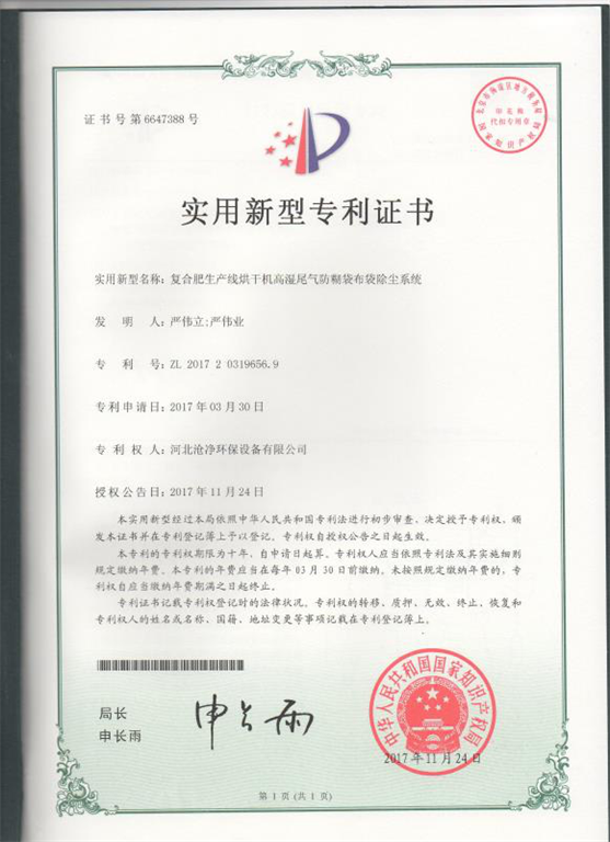 該烘干機高濕含塵尾氣配套的復(fù)合肥專用脈沖布袋除塵器采用了我公司研發(fā)的“復(fù)合肥生產(chǎn)線烘干機高濕尾氣防糊袋布袋除塵系統(tǒng)”專利技術(shù),專利號:ZL201720319656.9【專利技術(shù)所有權(quán)歸河北滄凈環(huán)保設(shè)備有限公司所有,真?zhèn)尾樵儗@麢z索及分析入口: http://www.pss-system.gov.cn/ 】