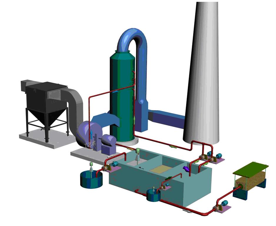 煙氣進(jìn)入噴淋脫硫塔筒體,由塔底進(jìn)入,經(jīng)密集的噴淋霧化層,煙氣與液體霧粒逆流充分接觸,在霧粒降落過(guò)程中吸收SO2 并捕潤(rùn)塵粒,濕潤(rùn)的塵粒向下流入脫硫塔底部,從溢流孔排出進(jìn)入沉淀池。在筒體內(nèi)上升的凈化后的氣體經(jīng)過(guò)氣水分離器除霧脫水,完成整個(gè)除塵脫硫程序,之后通過(guò)筒體上部錐體部分引出。含塵廢液通過(guò)筒體底部溢流孔排入沉淀池,(溢流孔有水封設(shè)計(jì)防止漏氣,并設(shè)有清理孔便于進(jìn)行筒體底部清理)經(jīng)沉淀(除灰)并加堿)后循環(huán)使用。