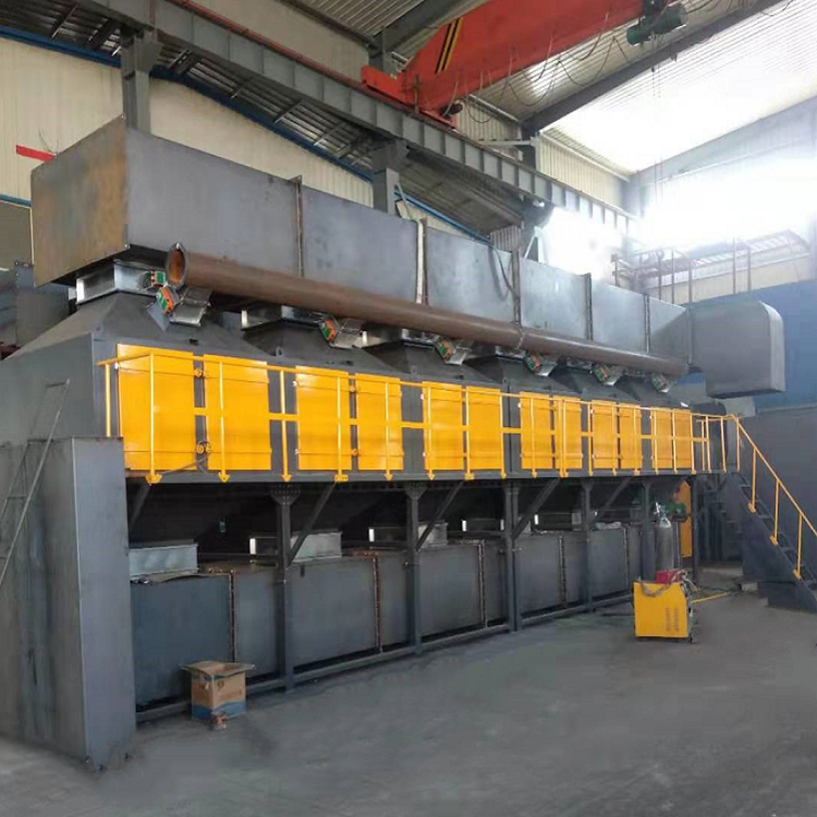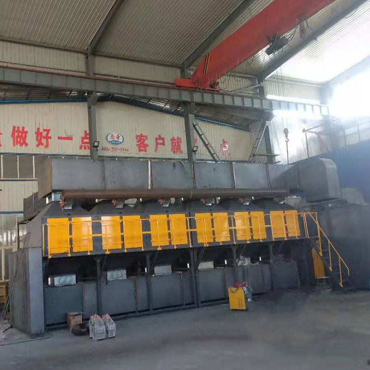 通過前面的預(yù)處理后,廢氣通入后端的活性炭吸附/脫附塔進(jìn)行吸附處理,通過活性炭微孔的有機(jī)氣體吸附在活性炭表面,去除廢氣中的有機(jī)物,抵達(dá)凈化氣體的作用。 催化燃燒裝置活性炭進(jìn)行脫附時,打開防爆閥同時啟動脫附風(fēng)機(jī)對催化劑進(jìn)行15分鐘的吹掃,然后防爆閥和脫附風(fēng)機(jī)關(guān)閉,3組加熱管開始分階段加熱,間隔2分鐘開啟一組,當(dāng)催化燃燒裝置溫度加熱到200攝氏度時,脫附風(fēng)機(jī)打開,將熱空氣向吸附箱吹送,熱空氣輸送到混流箱,進(jìn)行空氣中和,但熱空氣在混流箱內(nèi)溫度達(dá)到特定溫度時,空氣通過下端的輸送管輸送到活性炭的吸附室內(nèi),對活性炭進(jìn)行脫附,活性炭室內(nèi)溫度慢慢升高,活性炭內(nèi)有機(jī)廢氣分解出來,通過上面的管道回到催化裝置內(nèi)。與催化劑反應(yīng)生成CO2和H2O,同時產(chǎn)生大量的熱量。這時候加熱管會根據(jù)室內(nèi)溫度自動調(diào)節(jié)關(guān)閉一組或幾組加熱管,節(jié)約能源,催化劑表面都有陶瓷蓄熱體,能有效的鎖住熱量,降低能耗。